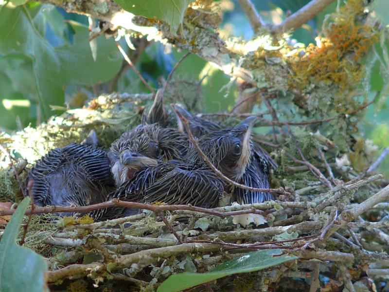 Mourning Doves. They nest way out on the end of live oak branches, and often late in the year. This was October.