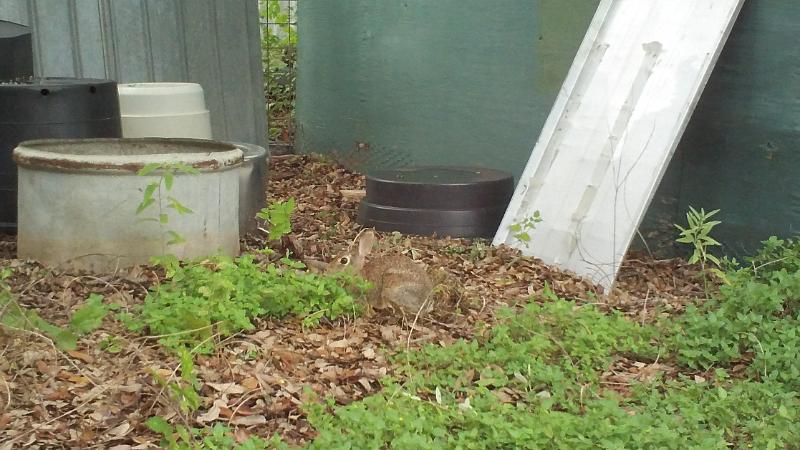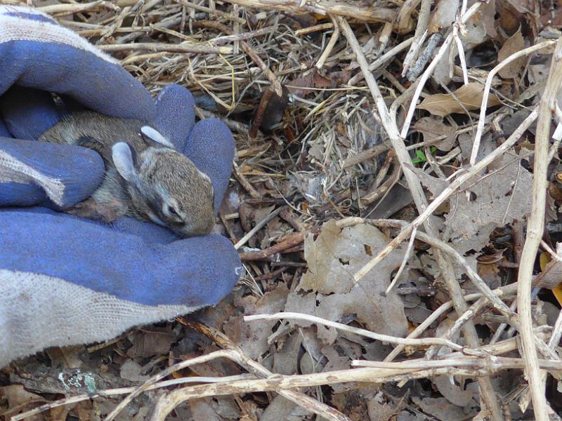 Baby Cottontail, 1 of 4. - Its nest is under the grass just to the right- a hollow about 5" deep.
