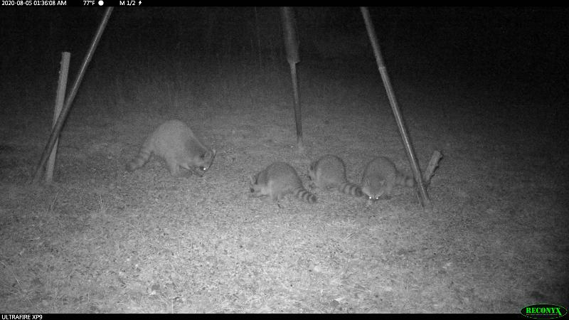 Raccoon family eating oats.