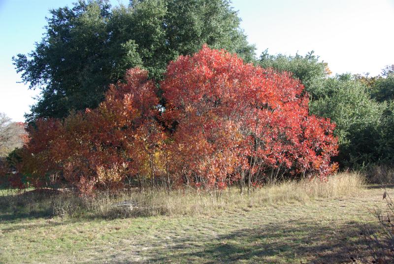 Flameleaf Sumac- pretty and good for birds. They spread profically!